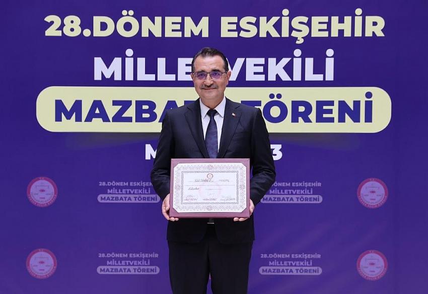 Enerji ve Tabii Kaynaklar Bakanı Fatih DÖNMEZ, Eskişehir Adliye Sarayı’nda düzenlenen törenle mazbatasını aldı. 14 Mayıs’ta yapılan 28’inci dönem milletvekilliği genel seçimlerinde AK Parti Eskişehir milletvekili seçilen Enerji ve Tabii Kaynaklar Bakanı Fatih DÖNMEZ, İl Seçim Kurulu üyesi hakimlerin elinden mazbata belgesini teslim aldı. Mazbatayı teslim aldıktan sonra sosyal medya hesaplarından açıklama yapan DÖNMEZ, “Görevimiz ne olursa olsun gayemiz tek. Sayın Ayşen Gürcan ile Mazbatamızı aldık. Eskişehir Milletvekili olarak milletimize, Eskişehir’imize hizmete devam." ifadelerini kullandı.