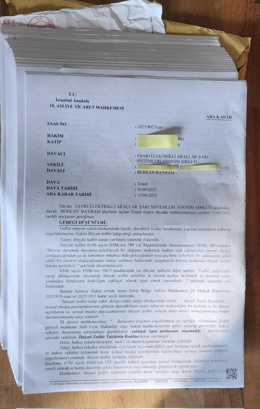 Ancak mahkeme, 15 Eylül 2025 tarihli ara kararla davayı usul yönünden reddetti. Mahkeme, davalı Berkan Bayram hakkında açılan davanın usul hatası nedeniyle REDDİNE, E-Şarj'ın taleplerinin DİĞER SARTLARI YOK sayılmasına" hükmetti. Mahkeme ayrıca, "Bayram'ın X hesabından yapılan paylaşımın sonrası engellenmesi isteğinin de REDDİNE" karar verdi. Ara karar, davanın esasına girilmeden reddedilmesi anlamına geliyor. Karar metninde, Bayram'ın paylaşımlarının "ifade özgürlüğü kapsamında" değerlendirilebileceği ve tüketici haklarını savunan bir dernek başkanı olarak meşru olduğu vurgusu dikkat çekiyor.