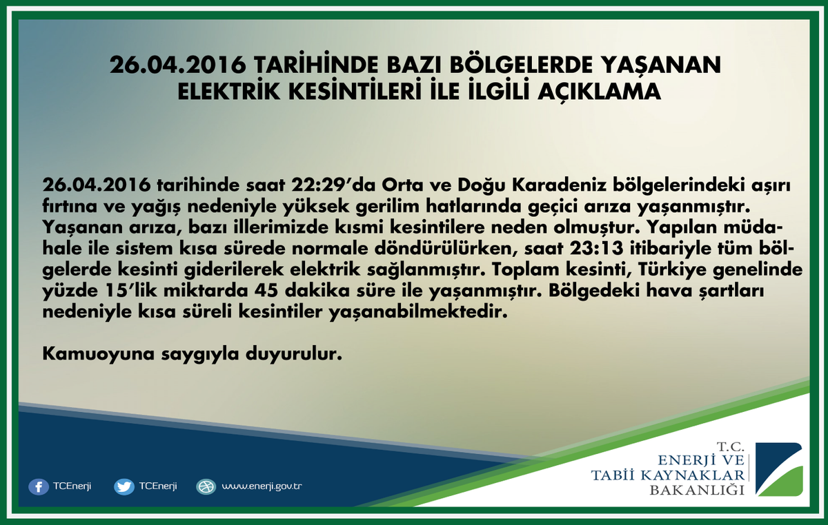 Bakanlıktan yapılan açıklamada ”26.04.2016 tarihinde saat 22.29’da Orta ve Doğu Karadeniz bölgelerindeki aşırı fırtına ve yağış nedeniyle yüksek gerilim hatlarında geçici arıza yaşanmıştır. Yaşanan arıza, bazı illerimizde kısmi kesintilere neden olmuştur. Yapılan müdahale ile sistem kısa sürede normale döndürülürken, saat 23,13 itibariyle tüm bölgelerde kesinti giderilerek elektrik sağlanmıştır.