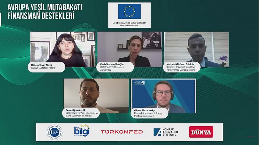 İktisadi Kalkınma Vakfı İstanbul AB Bilgi Merkezi ve TÜRKONFED, Avrupa Yeşil Mutabakatı konusunda farkındalık yaratmak ve finansman destekleri hakkında iş dünyasını bilgilendirmek üzere “Avrupa Yeşil Mutabakatı Finansman Destekleri” temalı bir webinar düzenledi. Etkinliğin açılış konuşmacıları arasında yer alan T.C. Dışişleri Bakan Yardımcısı ve AB Başkanı Büyükelçi Faruk Kaymakcı, Avrupa Birliği’nin başta Yeni Nesil Avrupa Fonu olmak üzere yeşil dönüşüm ve dijitalleşme kapsamında yararlanılabilecek programları olduğunu belirterek, özel sektöre ve sivil toplum kuruluşlarına bu alanlarda proje geliştirme çağrısı yaptı. Türkiye’nin Paris İklim Anlaşması’nı onaylamamasının gerekçesi hakkında da bilgi veren Kaymakcı, bu konuda müzakerelerin sürdüğünü, adil koşullar sağlandığında Türkiye’nin anlaşmaya katılacağını söyledi.